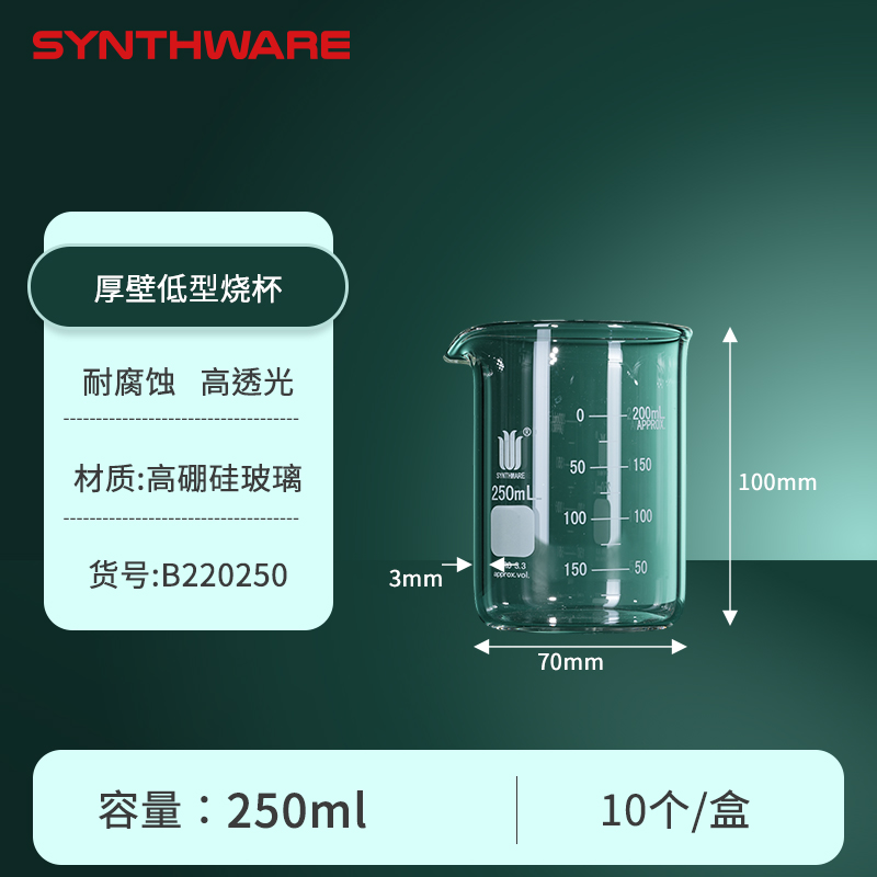 自制厚壁烧杯,双刻度线250ml,直径70*高度98*壁厚3.0mm,10个/盒 B220250