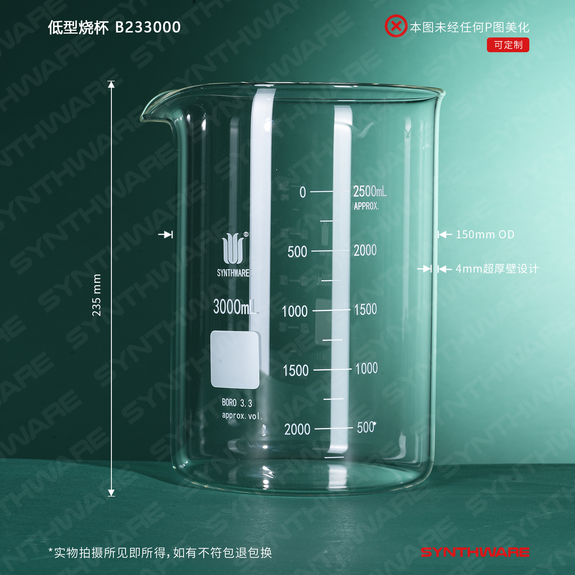 # 采用数控机床生产工艺使烧杯厚壁且均匀,烧杯壁和底部的厚度是市场上普通烧杯壁厚的2倍。烧杯整体加厚设计,增加了烧杯的抗机械冲击强度。