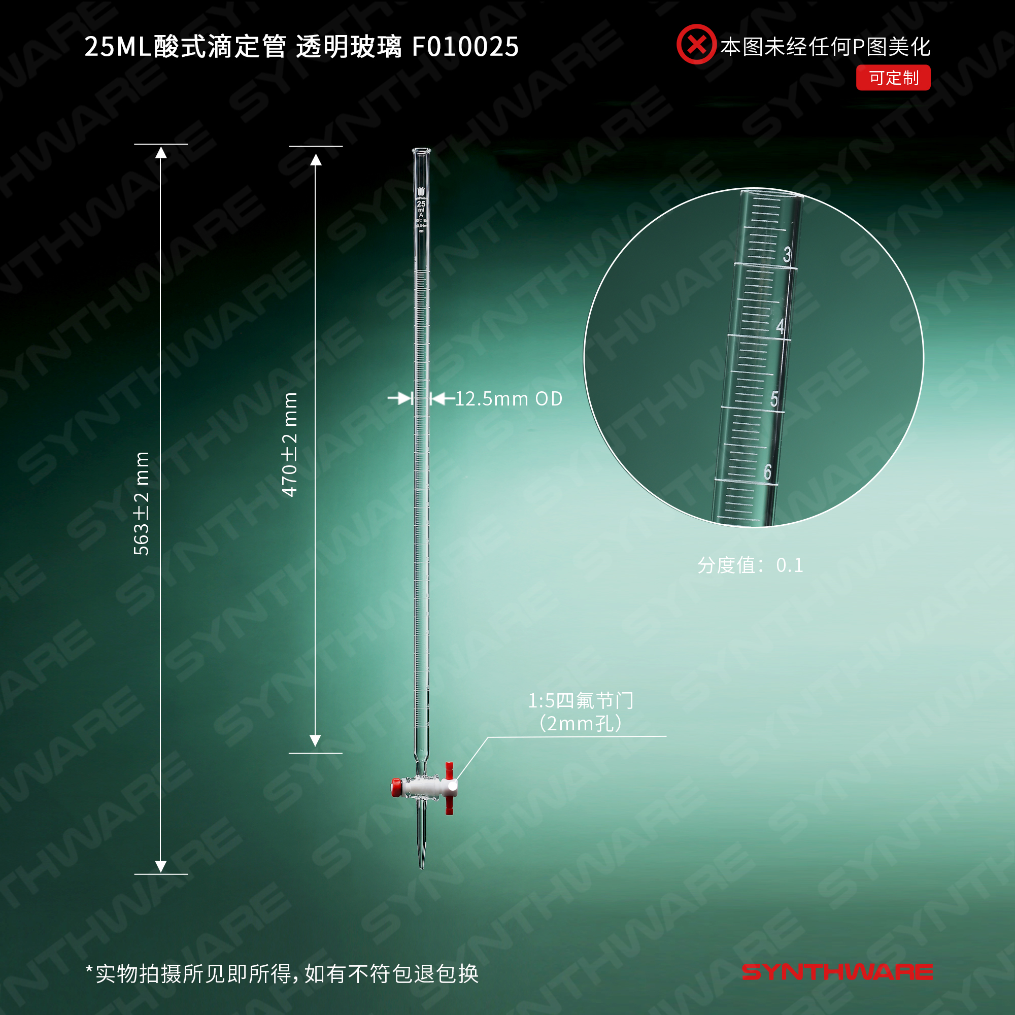 25ML酸式滴定管 透明玻璃(2MM四氟节门),(酸碱通用)1支/盒 F010025