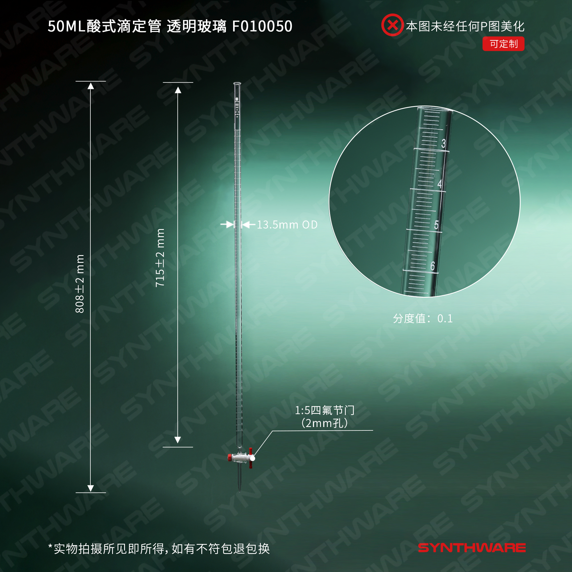 50ML酸式滴定管 透明玻璃(2MM四氟节门),(酸碱通用)1支/盒 F010050