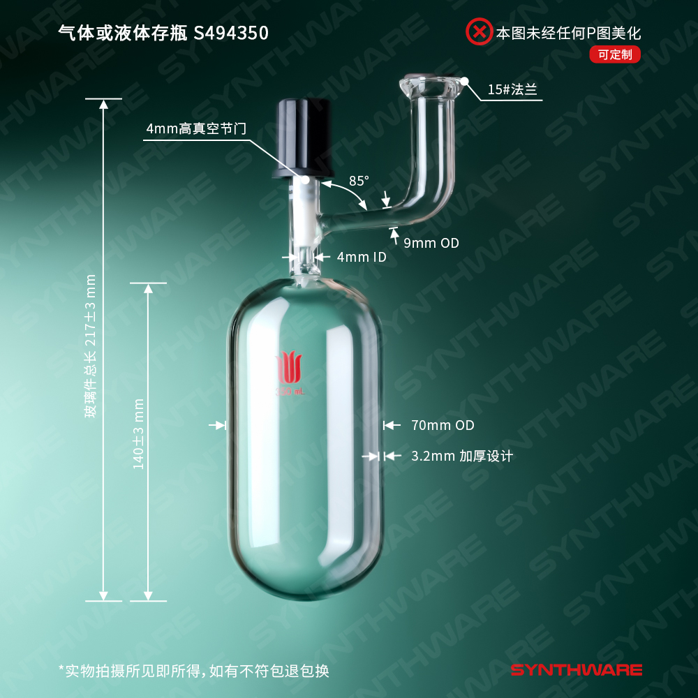 溶剂存储瓶 > 直管型溶剂存储瓶 > 带砝兰口直管型溶剂存储瓶 > SYNTHWARE > 气体或液体存瓶,15#砝兰口,4mm高真空,容量350ml S494350