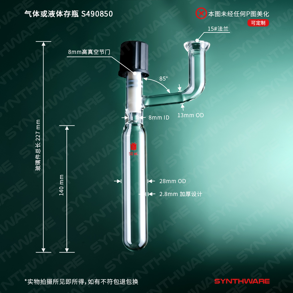 溶剂存储瓶 > 直管型溶剂存储瓶 > 带砝兰口直管型溶剂存储瓶 > SYNTHWARE > 气体或液体存瓶,15#砝兰口,8mm高真空,容量:50ml S490850