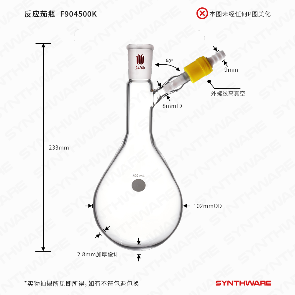 反应茄瓶,磨口:24/40,500ml,带通气孔高真空阀 F904500K