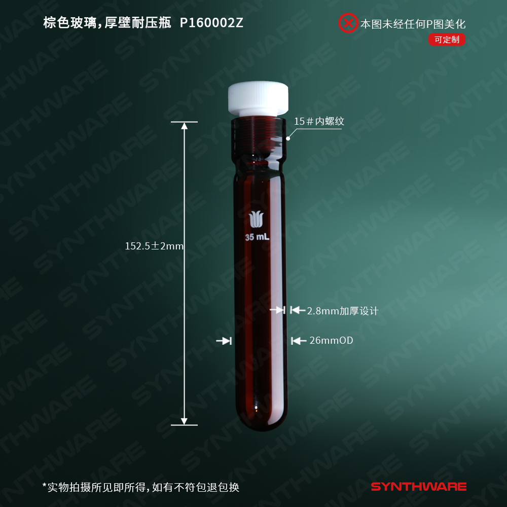 # #15内螺纹棕色厚壁耐压管,可用于对光敏感的反应,防止光敏物质发生分解。标配有四氟螺纹盖(B100015G)以及EP材质O型圈(R111EP)。