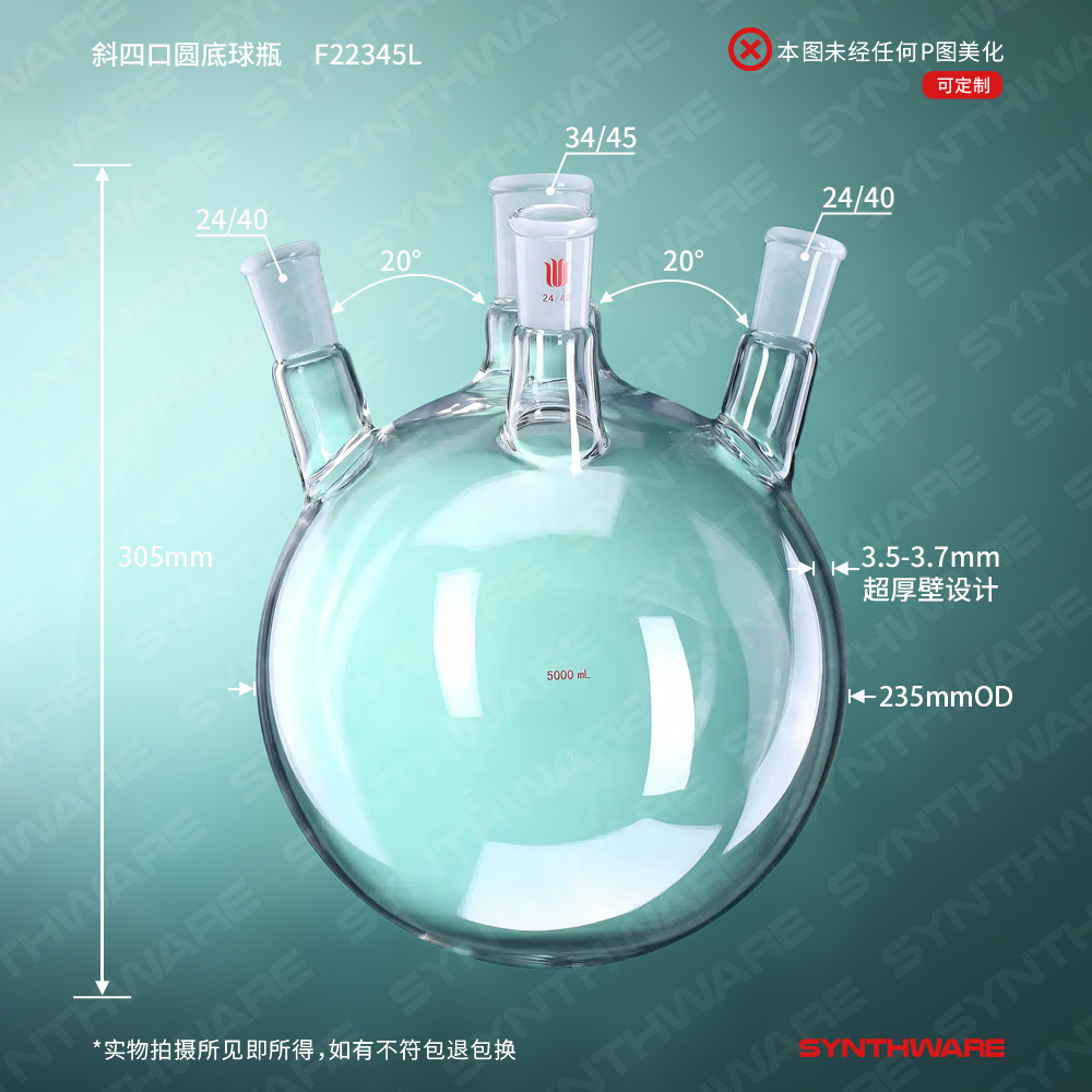 斜四口圆底球瓶,主口:34/45,侧磨口:29/42,前口24/40,,5000ml F22385L