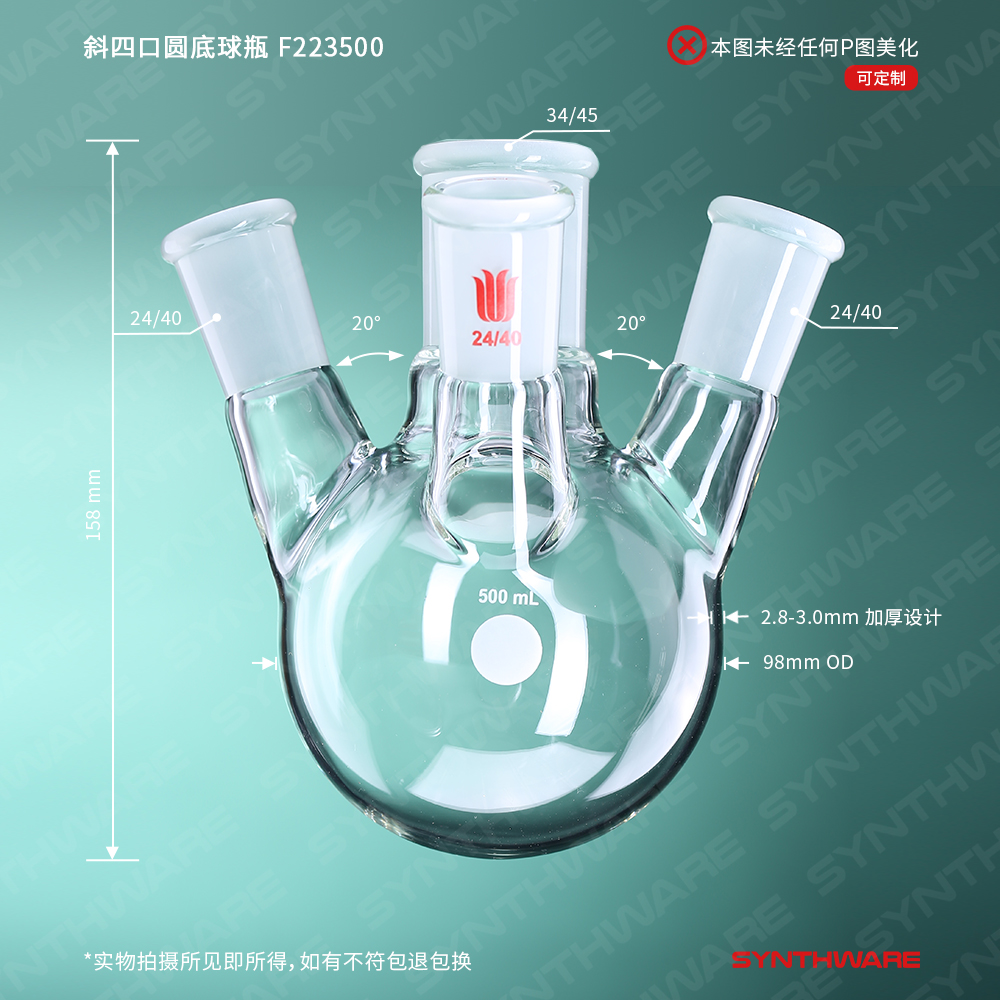 斜四口圆底球瓶,中间磨口:29/42,侧磨口:24/40,500ml F222500