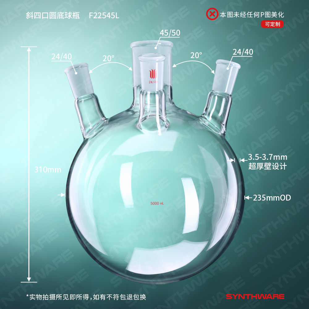 斜四口圆底球瓶,中间磨口:34/45,侧口和前口:24/40,5000ml F22345L