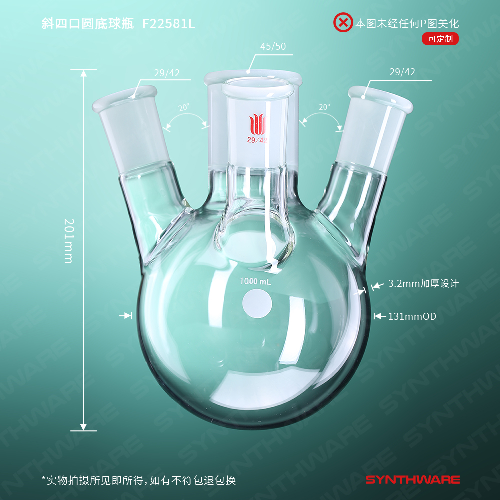 斜四口圆底球瓶,中间磨口:34/45,侧磨口:29/42,1000ml F22381L