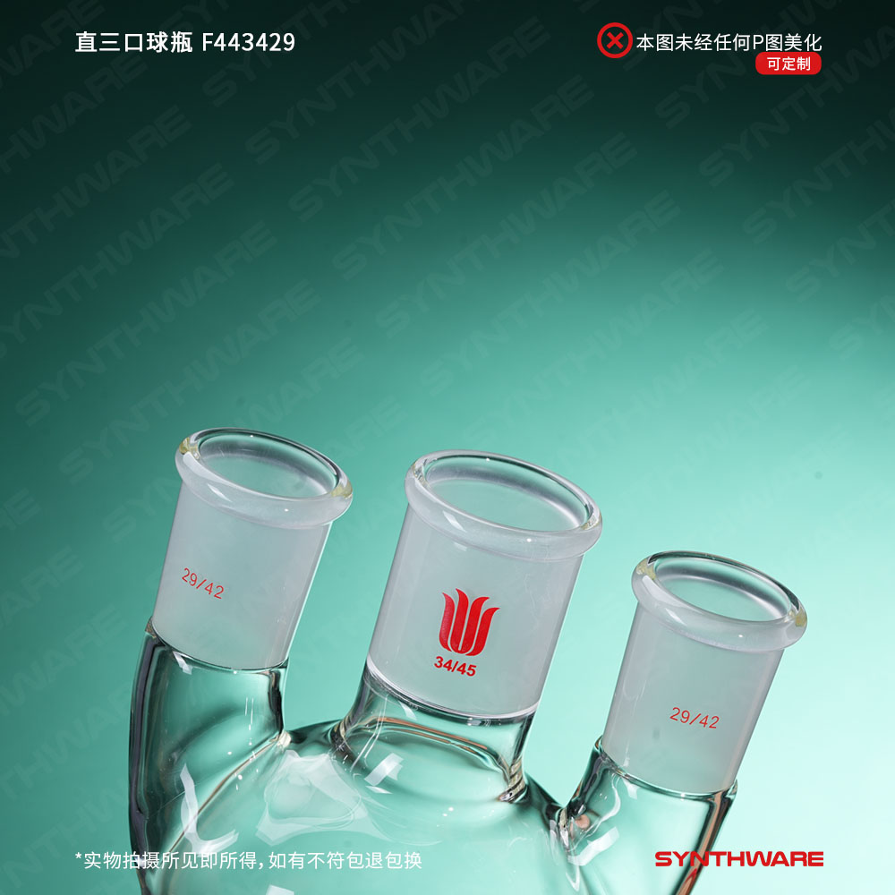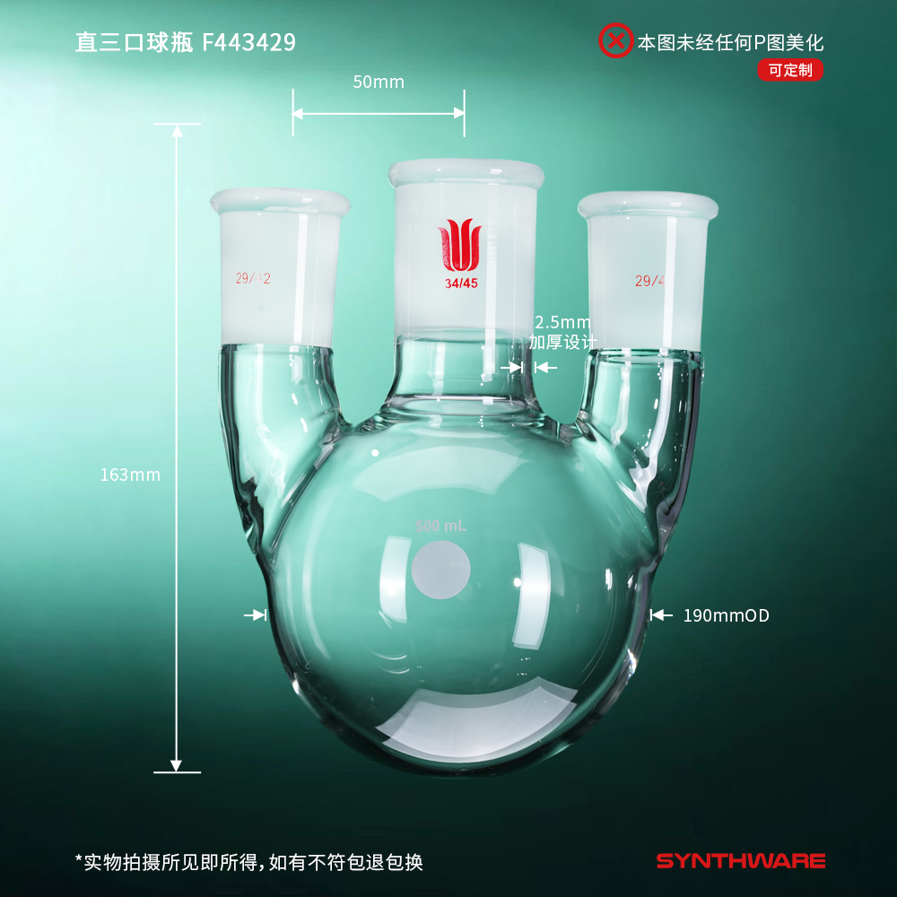 直三口球瓶,厚壁高强度,中间磨口:34/45,侧磨口:29/42,500ml F443429