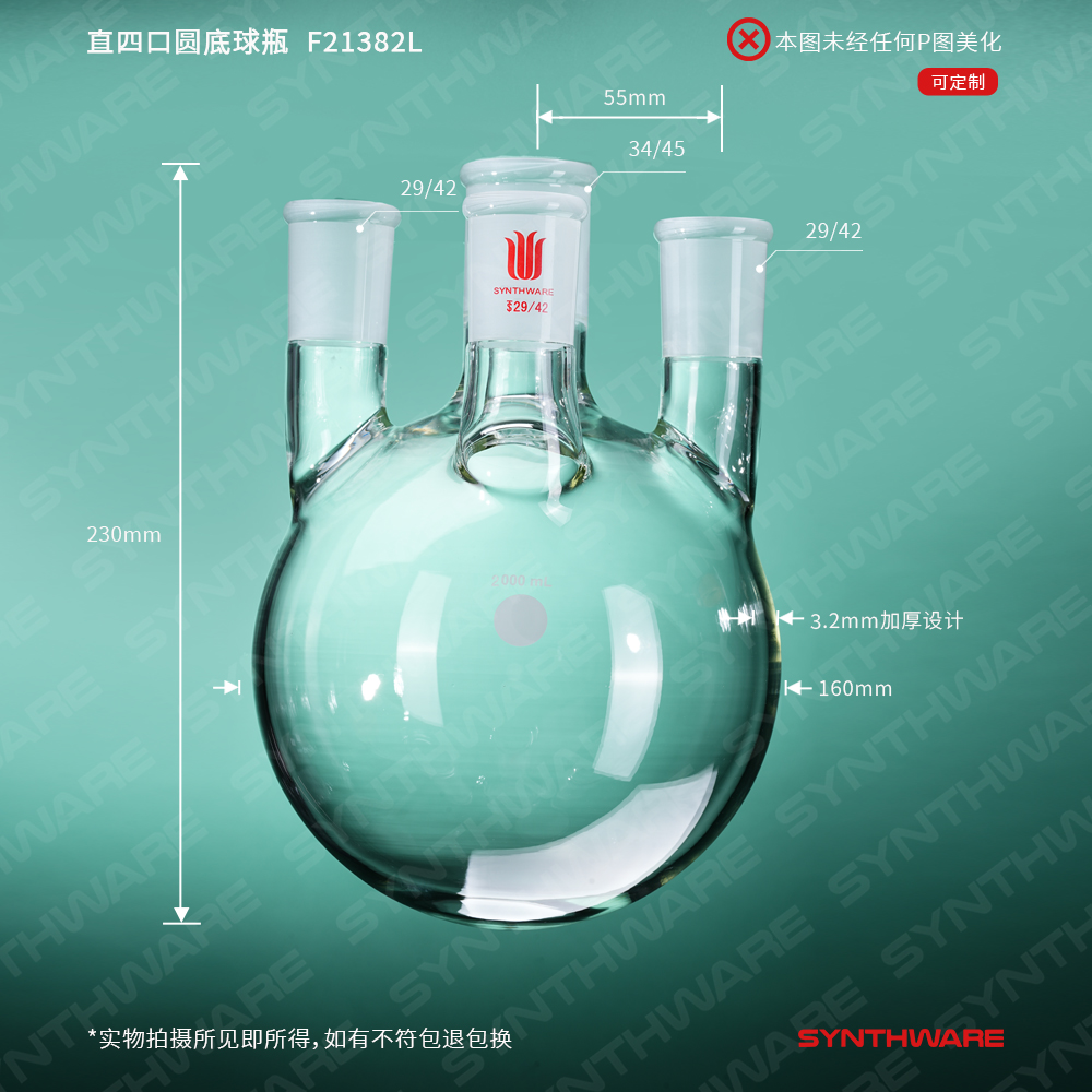 直四口圆底球瓶,中间磨口:34/45,侧磨口:29/42,2000ml F21382L