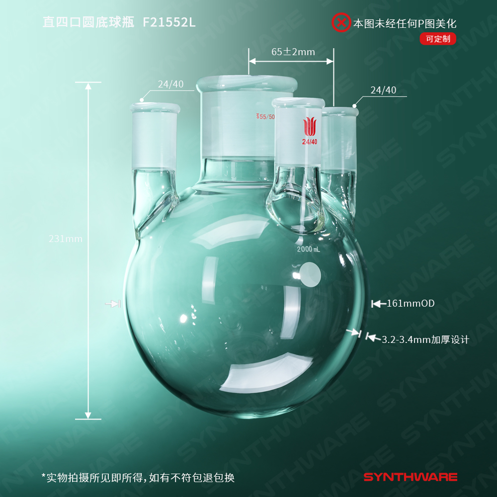 直四口圆底球瓶,中间磨口:55/50,侧磨口:24/40,2000ml F21552L