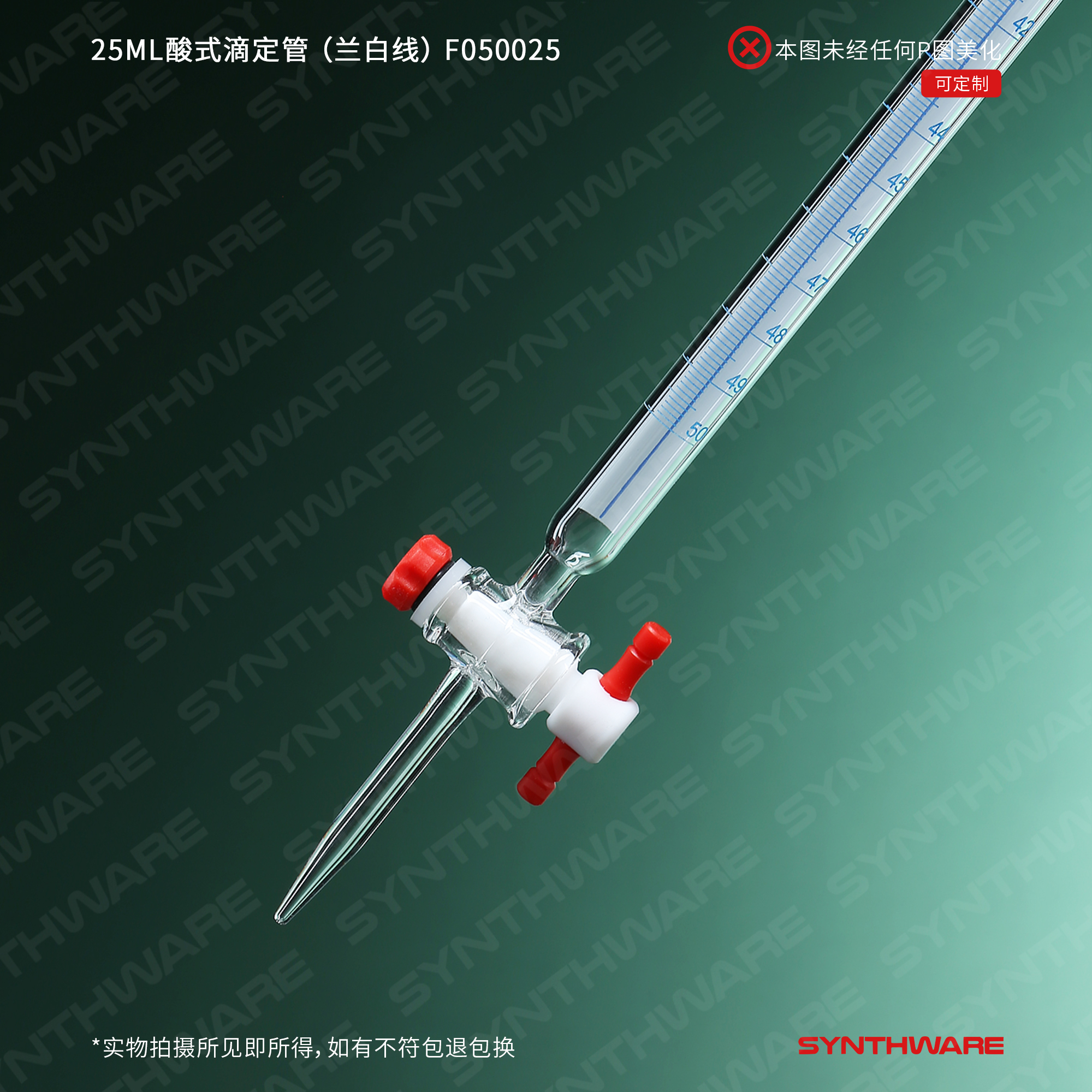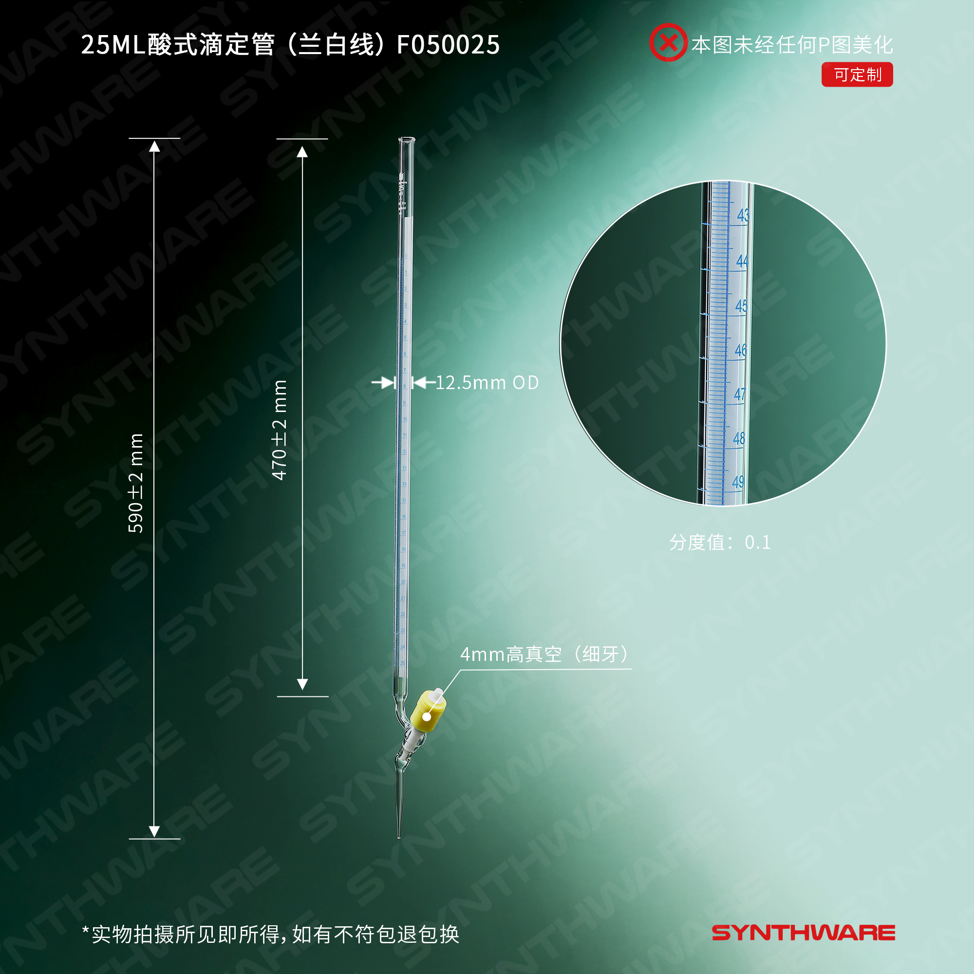 25ML酸式滴定管 (蓝白线)高硼硅透明玻璃,(新型高真空截门)(酸碱通用) F050025