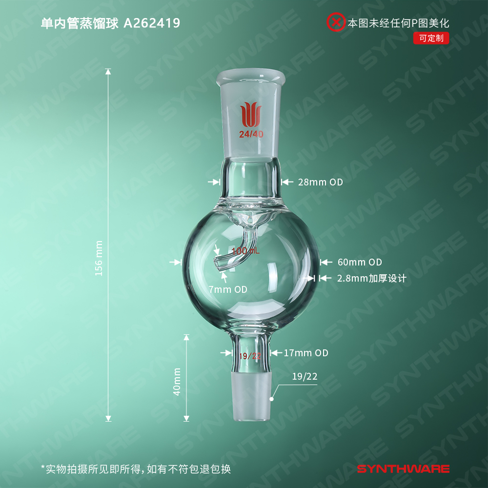 单内管蒸馏球,上磨口:24/40,下磨口:19/22,100ml A262419