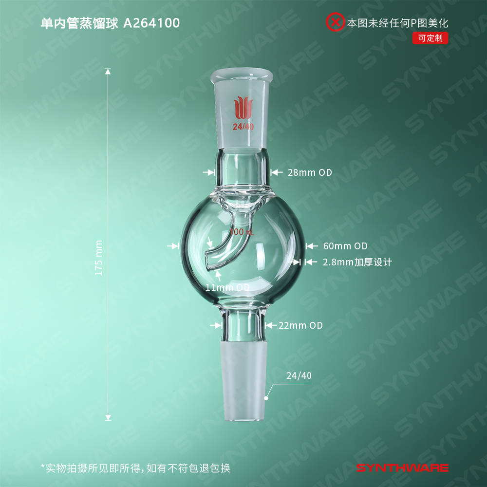 单内管蒸馏球,上磨口:24/40,下磨口:24/40,100ml A264100