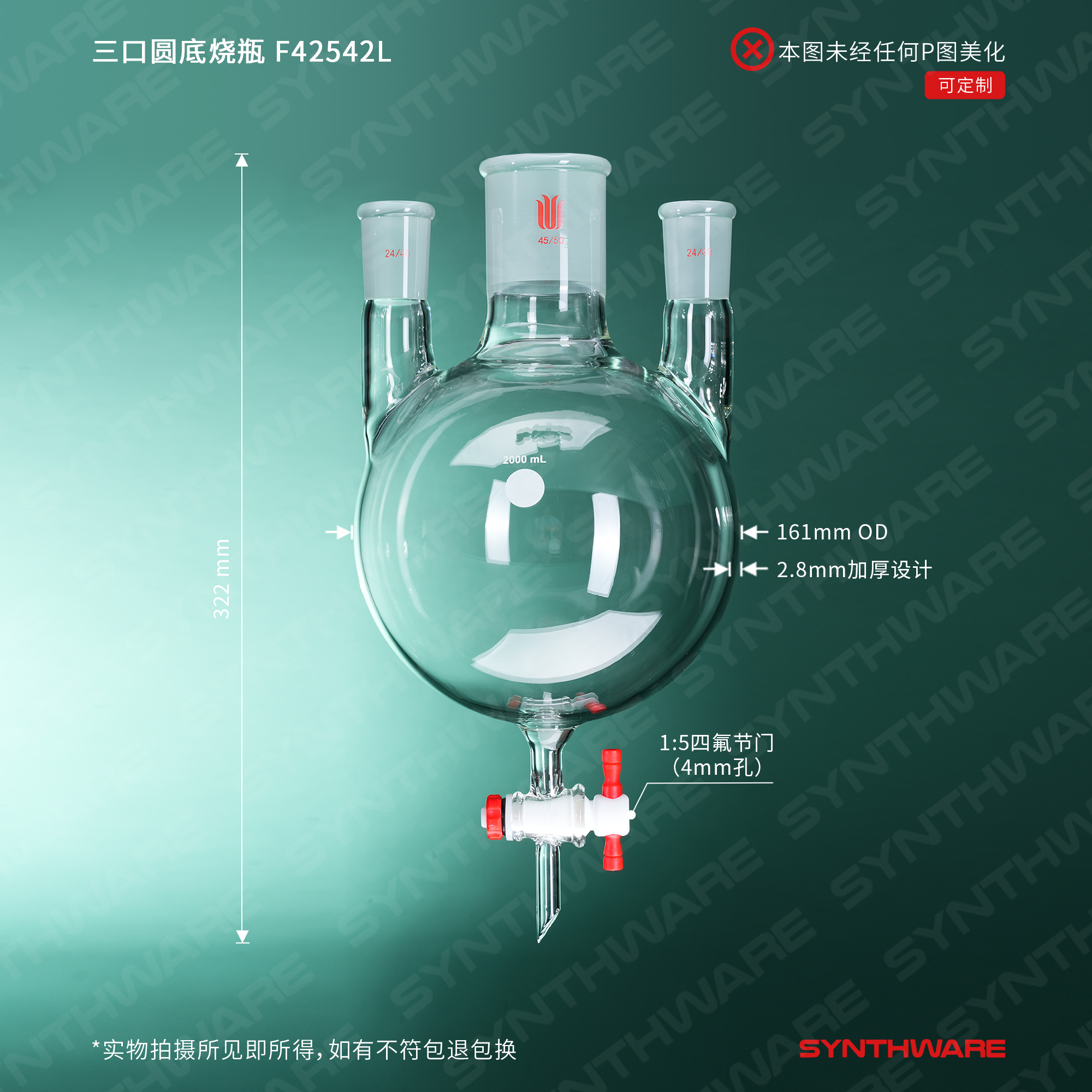 三口圆底烧瓶,四氟节门,中间磨口:45/50,侧磨口:24/40,2000ml F42542L