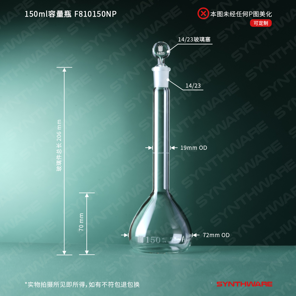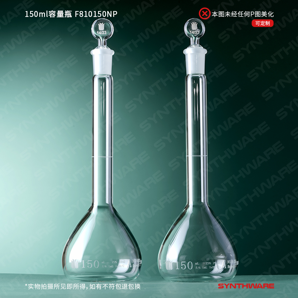 14/23口 150ml容量瓶,标配玻璃塞,不带个体检测证书,2支/盒 F810150NP