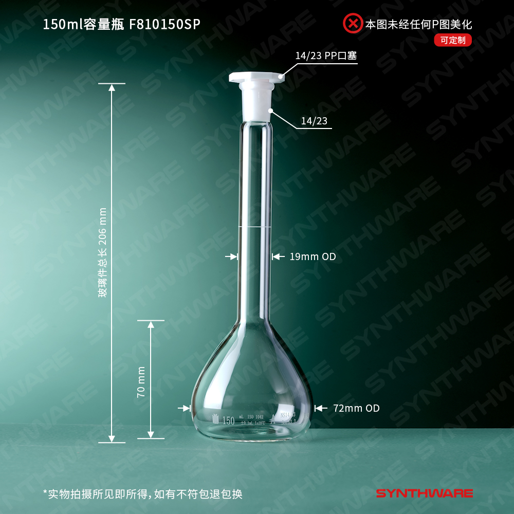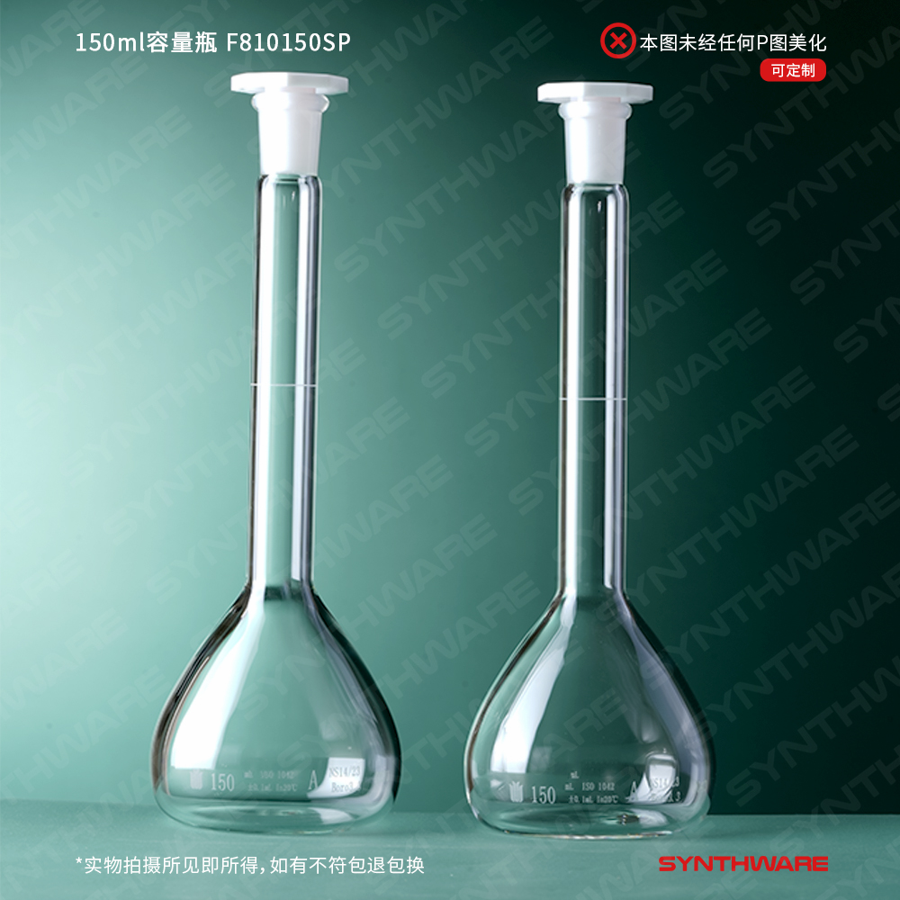 14/23口 150ml容量瓶,标配塑料塞,不带个体检测证书,2支/盒 F810150SP
