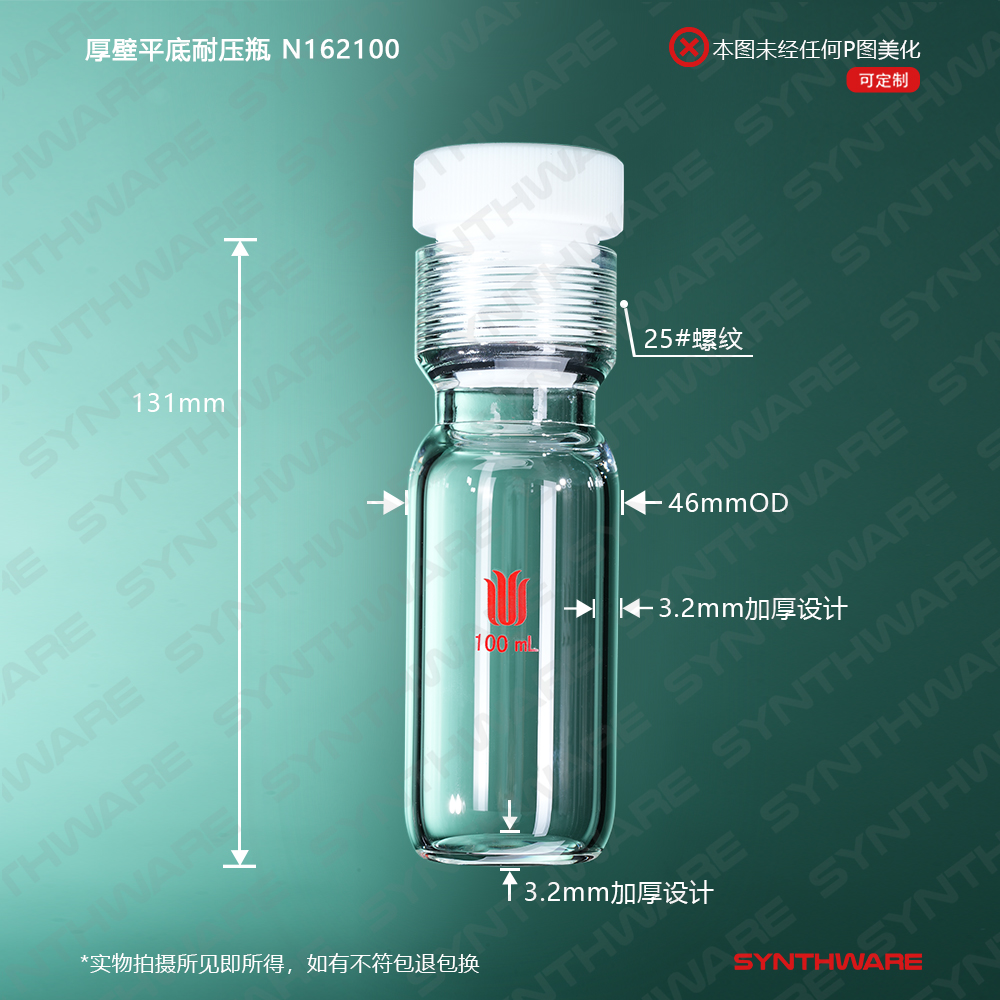 # 平底内螺纹厚壁耐压瓶,瓶身采用3.3高硼硅厚壁玻璃管制得。标配四氟螺纹盖和VitonO型圈。