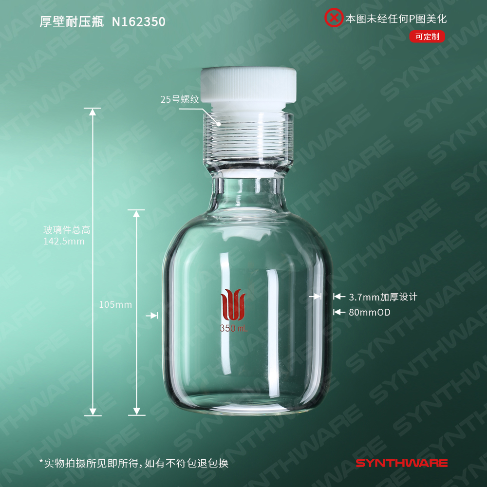 厚壁平底耐压瓶,螺纹25#,容量350ml,瓶身外径80*螺纹口以下长度105mm N162350