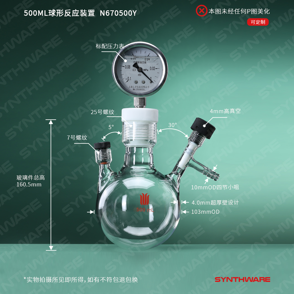 500ML球形反应装置,左侧口为温度计螺纹(含-0.1—0 MPa真空表) N670500Z