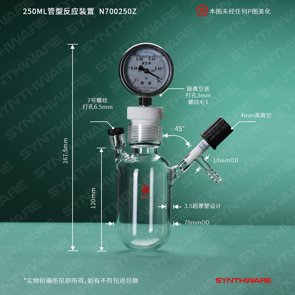 管型反应装置,25#内螺纹口(标配-0.1-0 MPa真空表),250ML,左侧温度计螺纹,右侧4mm高真空节门 N700250Z
