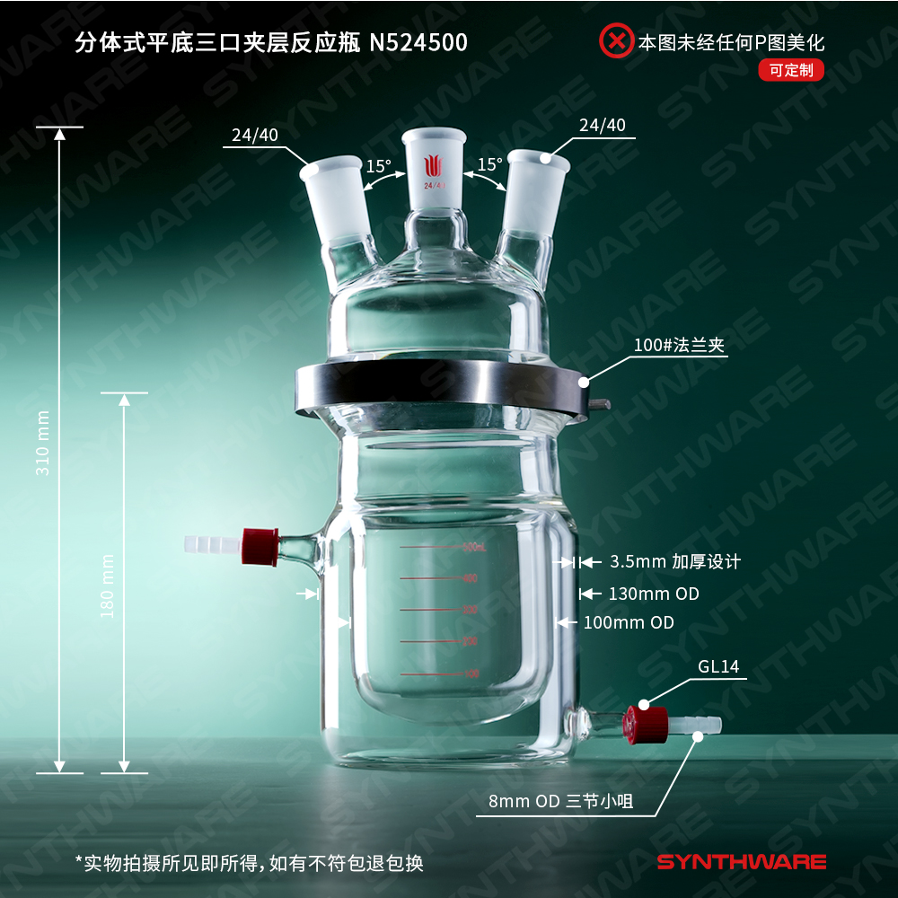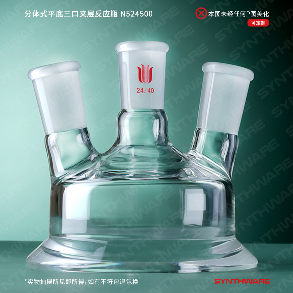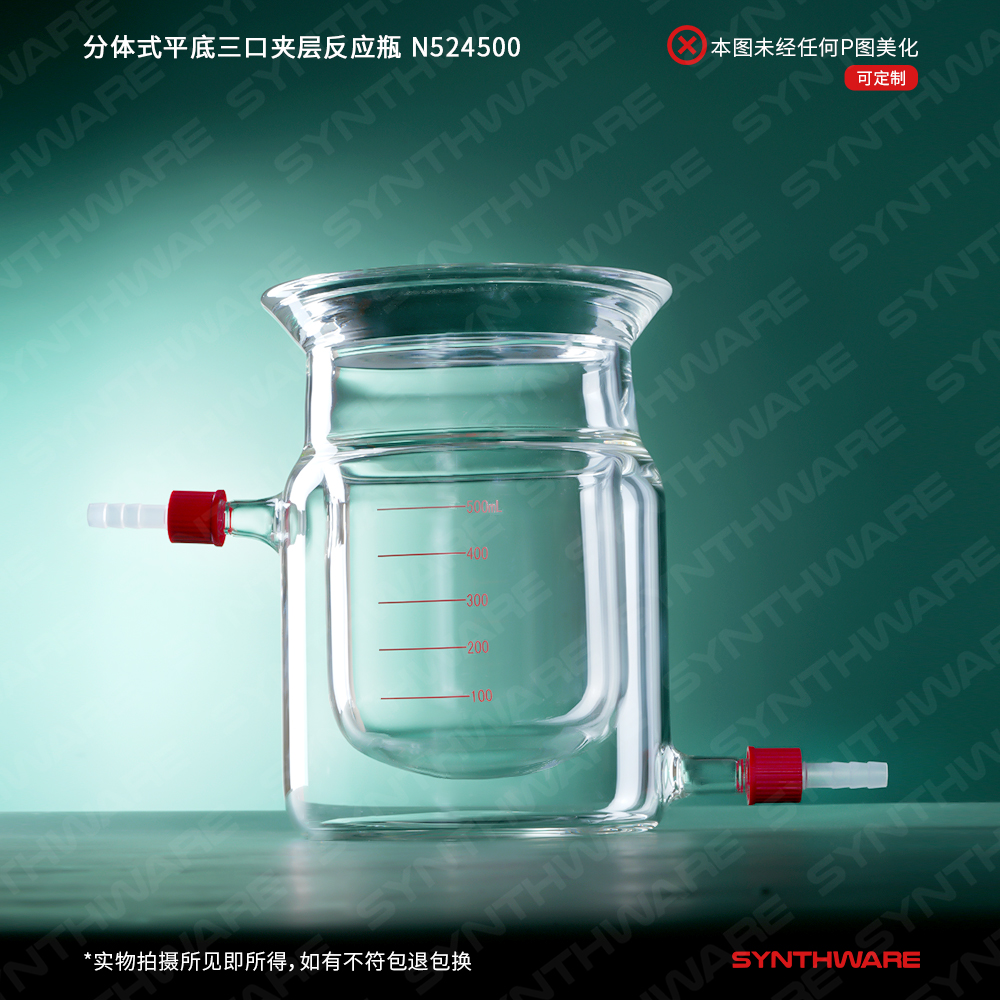 分体式平底三口夹层反应瓶,容量:500ML,磨口:24/40,右侧口可匹配温度计套管 N524500T