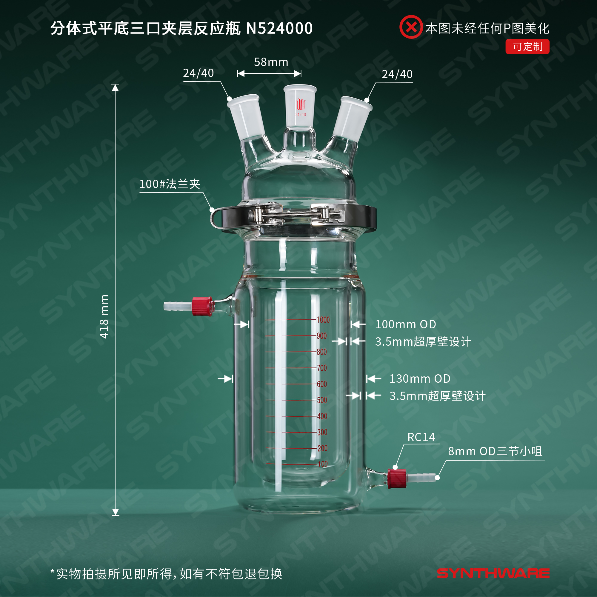 分体式平底三口夹层反应瓶,容量:1000ML,磨口:24/40,右侧口可匹配温度计套管 N524000T