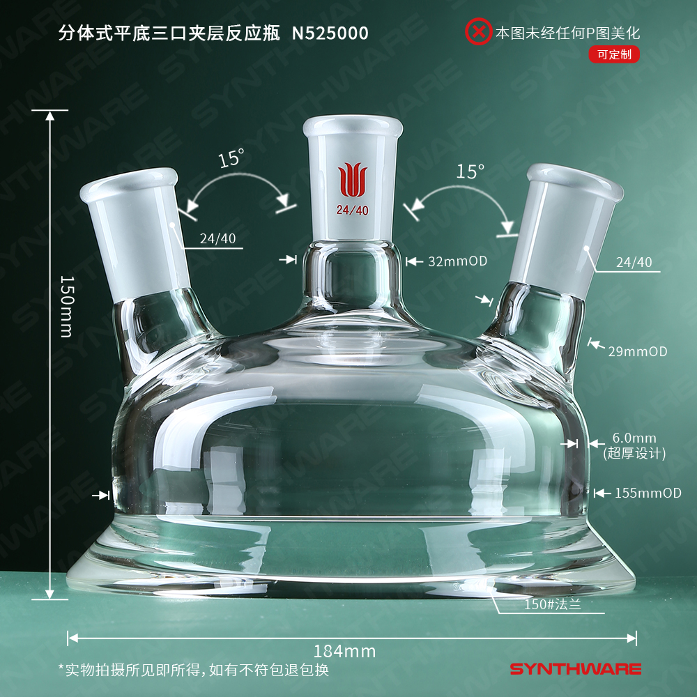 分体式平底三口夹层反应瓶,容量:500ML,磨口:24/40,右侧口可匹配温度计套管 N524500T