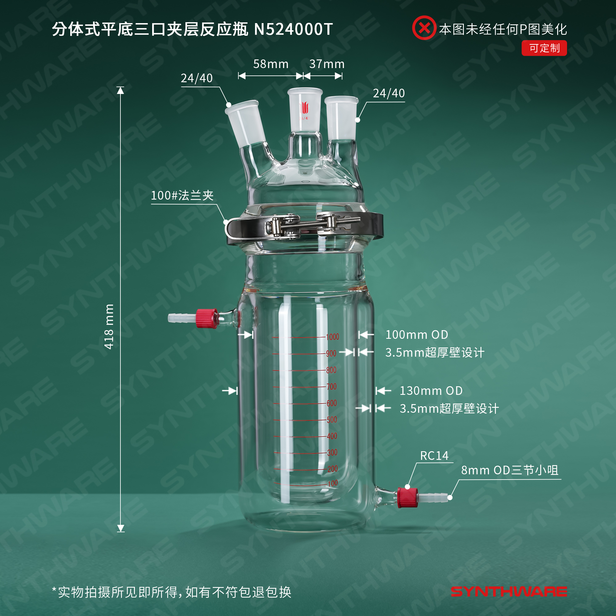 分体式平底三口夹层反应瓶,容量:1000ML,磨口:24/40,右侧口可匹配温度计套管 N524000T