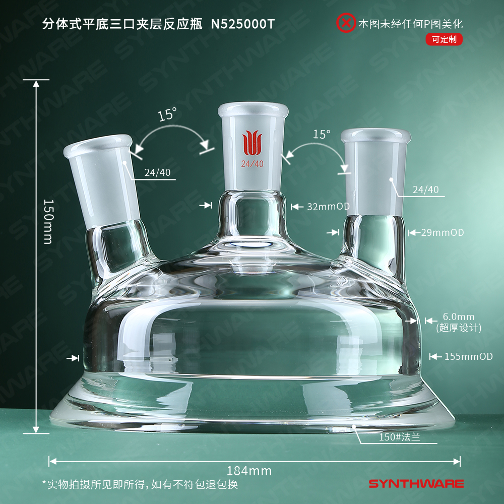 分体式平底三口夹层反应瓶,容量:500ML,磨口:24/40,右侧口可匹配温度计套管 N524500T