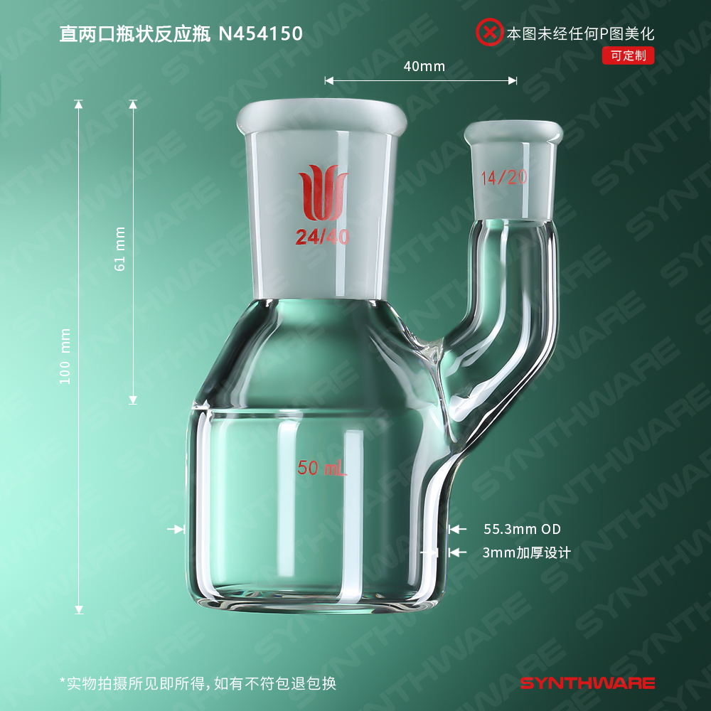直两口瓶状反应瓶,容量:50ML,主口24/40,侧口14/20 N454150