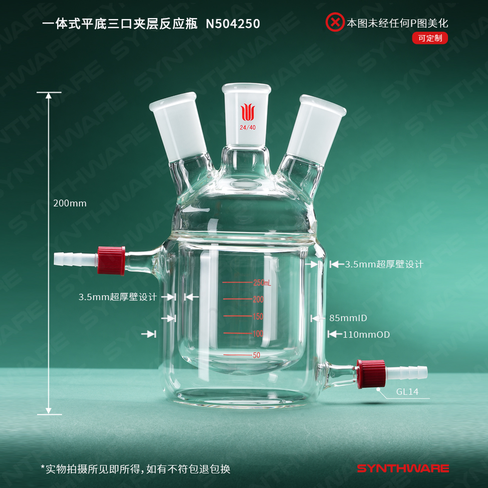 一体式平底三口夹层反应瓶,容量:250ML,磨口:24/40,右侧口可匹配温度计套管 N504250T