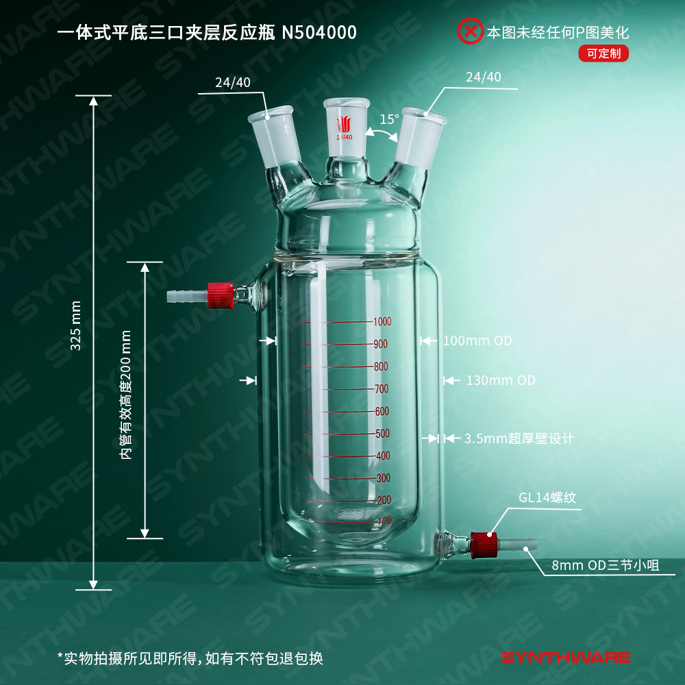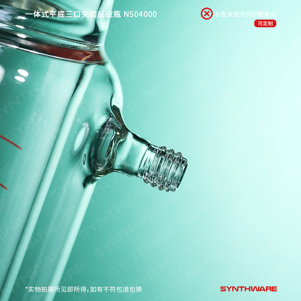 一体式平底三口夹层反应瓶,容量:1000ML,磨口:24/40,右侧口可匹配温度计套管 N504000T