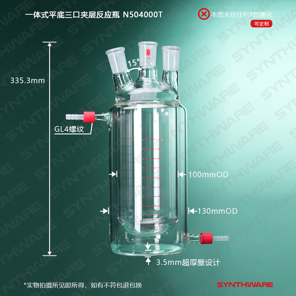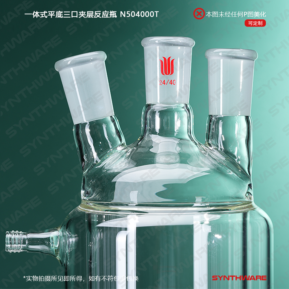 一体式平底三口夹层反应瓶,容量:3000ML,磨口:24/40,右侧口可匹配温度计套管 N503000T