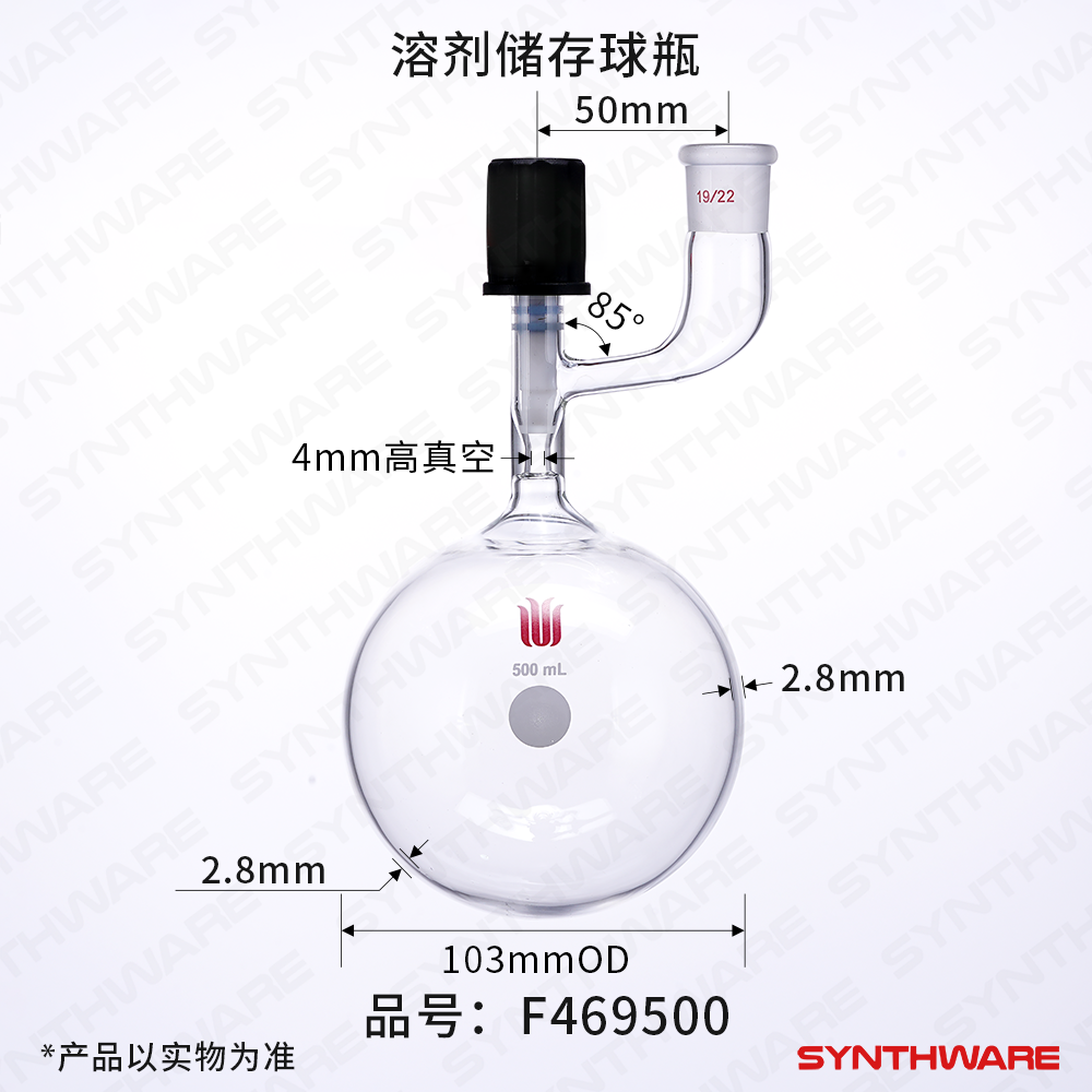 溶剂储存球瓶,内磨口:19/22,容量:500ml,4mm高真空阀 F469500
