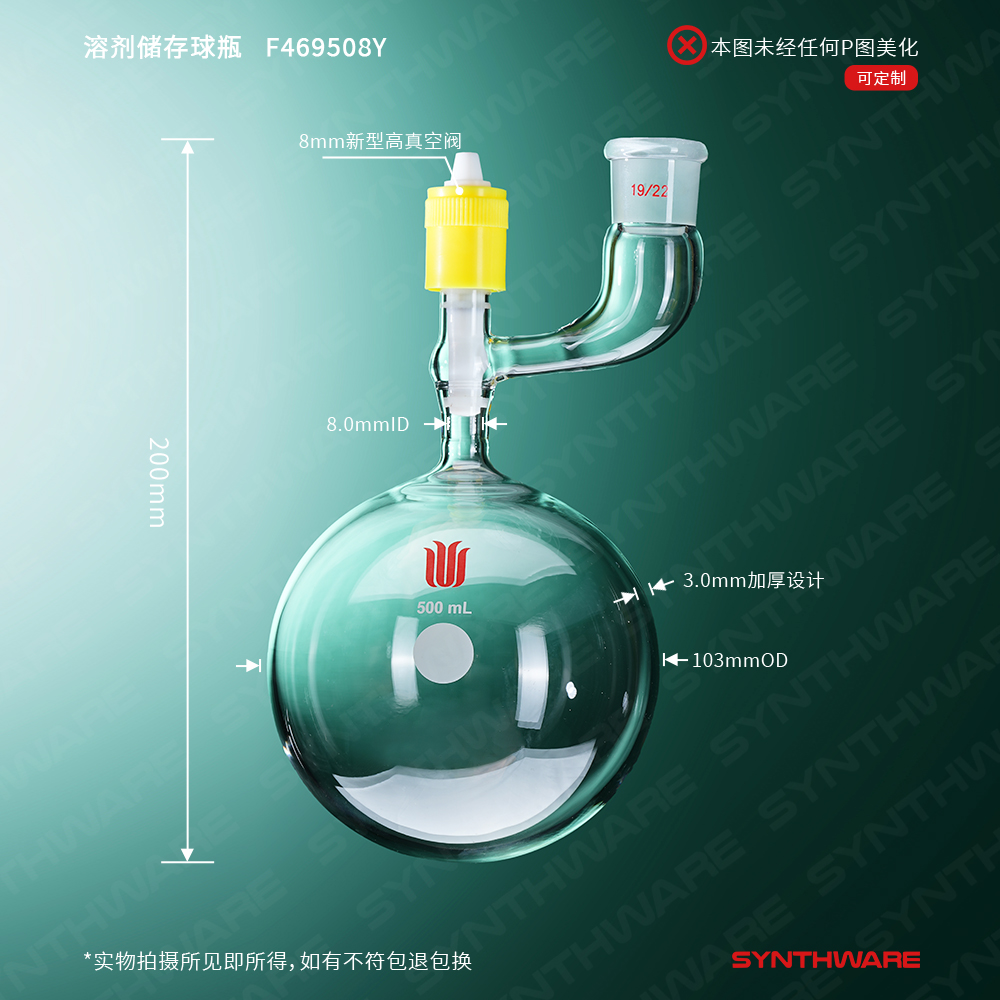 溶剂储存球瓶,内磨口:19/22,容量:500ml,8mm新型高真空阀 F469508Y