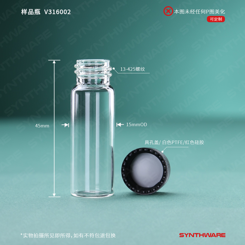 13-425螺纹口透明样品瓶4ml(15*45mm开口黑盖白色PTFE/红色硅胶)100/套 V316002