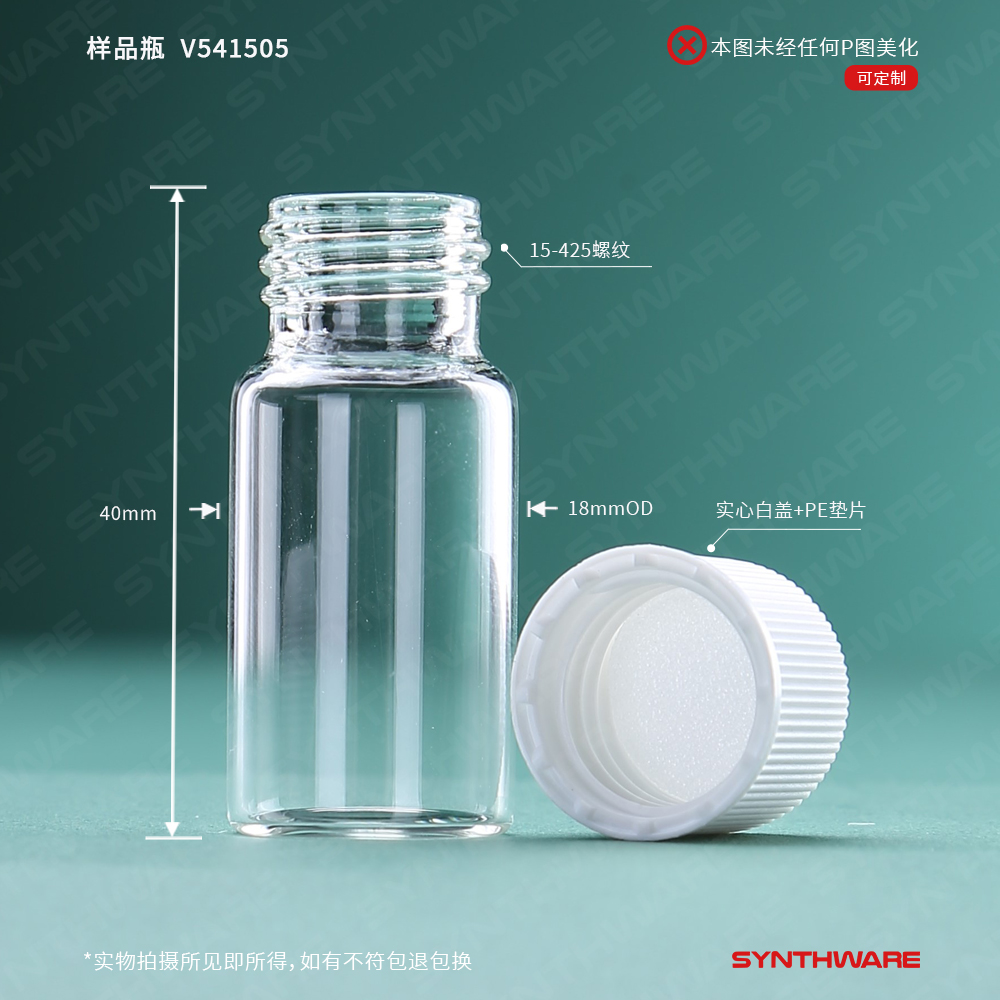 15-425螺纹口透明玻璃样品瓶,5ml,18*40mm,样品瓶+实心白盖+PE垫片 100套/套 V541505