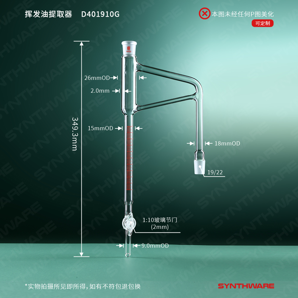 挥发油提取器,重油,带刻度,磨口19/22,容量:10ml,四氟节门 D401910S