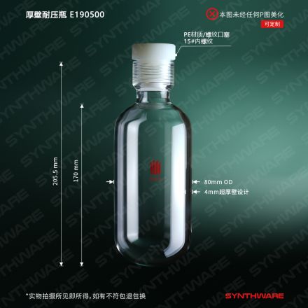 # 内螺纹厚壁耐压瓶,标配有PE材质螺纹盖以及可替换四氟密封盖(欣维尔专利产品2025204895739),耐溶剂腐蚀,密封性好,相较于四氟材质螺纹盖配全惰性O型圈组合,更加经济实惠。
