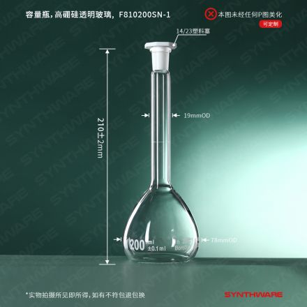 14/23口 200ml容量瓶,标配塑料塞,带个体检测证书, F810200SN-1 F810200SN-1