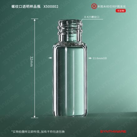 样品瓶 > 高硼硅玻璃样品瓶 > 样品瓶 > SYNTHWARE > 样品瓶,2ml,8-425螺纹口,11.6*32mm 高硼硅3.3透明玻璃,100个/盒 X500802