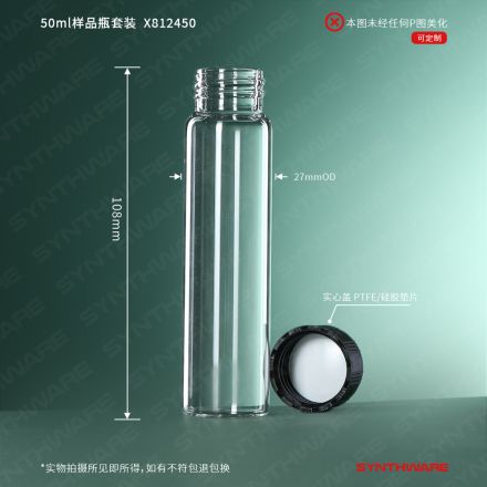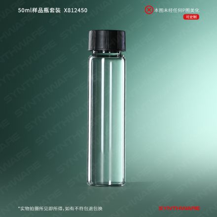 样品瓶 > 高硼硅玻璃样品瓶 > 样品瓶+盖垫套装 > SYNTHWARE > 50ml样品瓶套装,高硼硅3.3透明玻璃,24-400螺纹,27*108mm,实心盖 PTFE/硅胶垫片,100/套 X812450