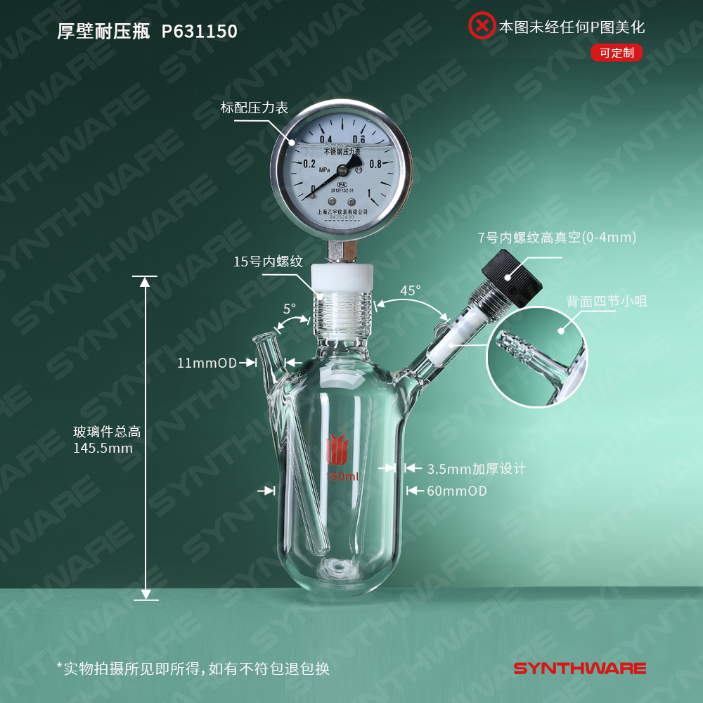 厚壁耐压瓶,带刻度,15#内螺纹口带压力表,单侧高真空阀,具温度计套管,容量:150ml P631150
