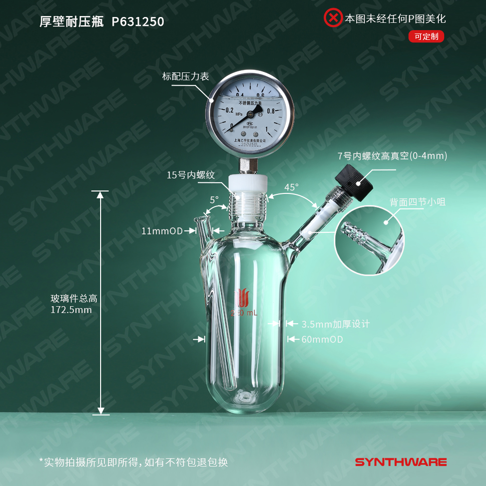 厚壁耐压瓶,带刻度,25#螺纹口带压力表,单侧内螺纹高真空,具温度计套管,容量:350ml P632350