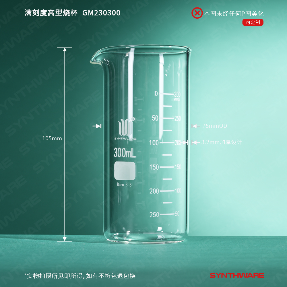 # 采用数控机床生产工艺使烧杯厚壁且均匀,烧杯壁和底部的厚度是市场上普通烧杯壁厚的2倍。烧杯整体加厚设计,增加了烧杯的抗机械冲击强度。