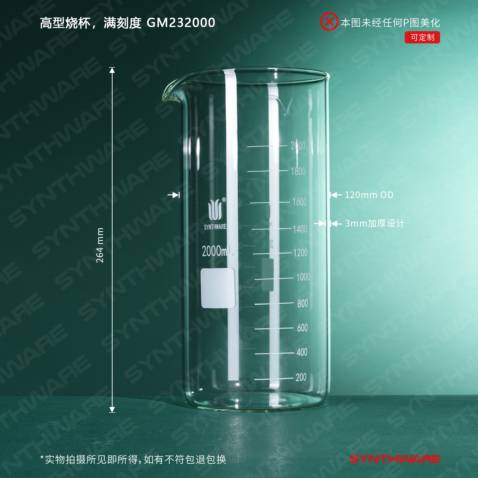 # 采用数控机床生产工艺使烧杯厚壁且均匀,烧杯壁和底部的厚度是市场上普通烧杯壁厚的2倍。烧杯整体加厚设计,增加了烧杯的抗机械冲击强度。
