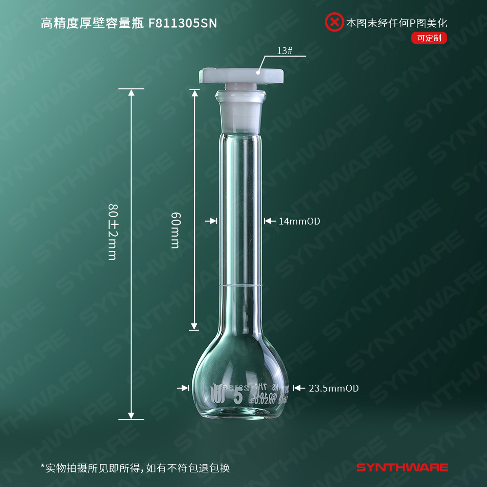 高精度厚壁容量瓶(附常数A级 带编码),高硼硅透明玻璃, 13#口 5ML 配13#塑料塞 F811305SN