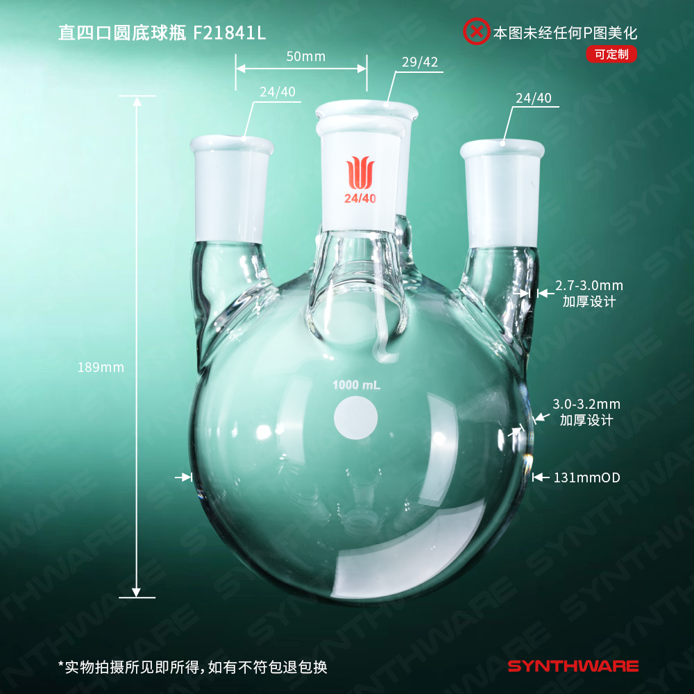 直四口圆底球瓶,中间磨口:29/42,侧磨口:24/40,1000ml F21841L