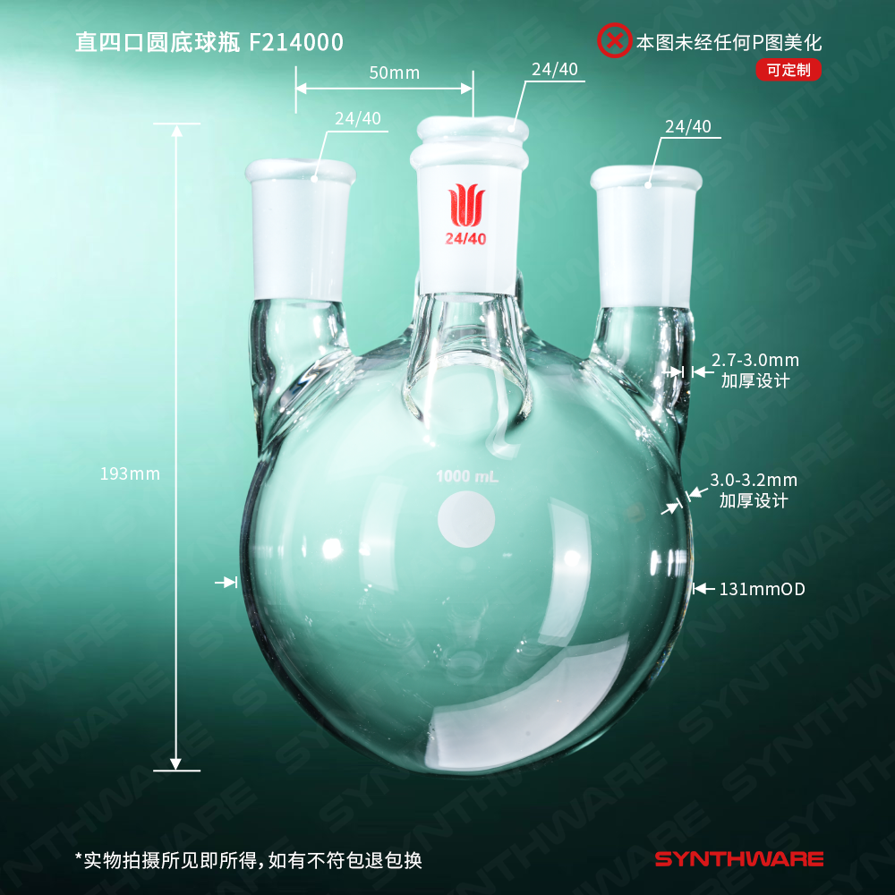 直四口圆底球瓶,中间磨口:24/40,侧磨口:24/40,1000ml F214000